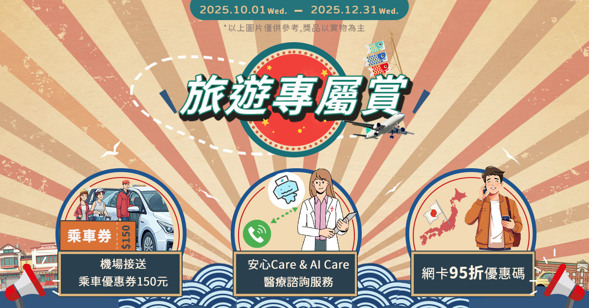 保費達新台幣1,000元(含)以上,旅遊地點為海外地區並完成付款者,即可領取「安心Care醫療諮詢服務抵用碼」乙組。