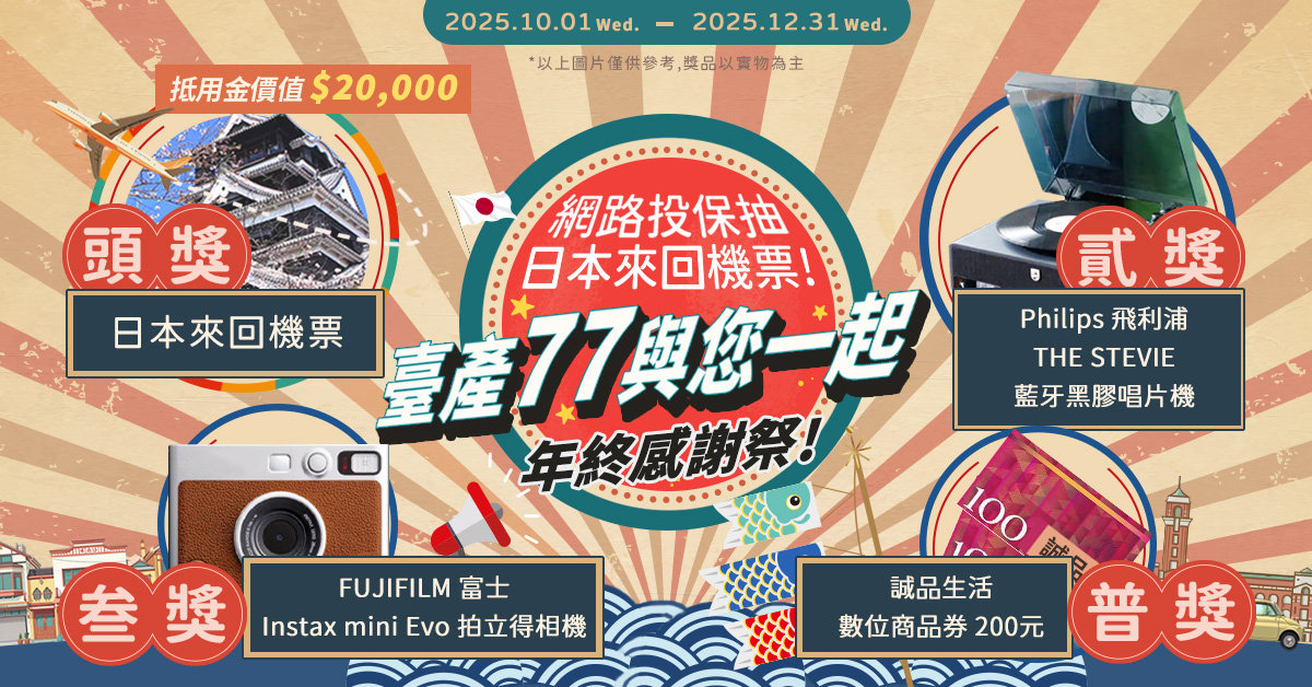 網路投保【強制險+任意險】,即可抽日本來回機票抵用金(價值新臺幣2萬元)、 Philips 飛利浦THE STEVIE 藍牙黑膠唱片機、 FUJIFILM 富士 Instax mini Evo 拍立得相機與誠品生活數位商品券 200元! |