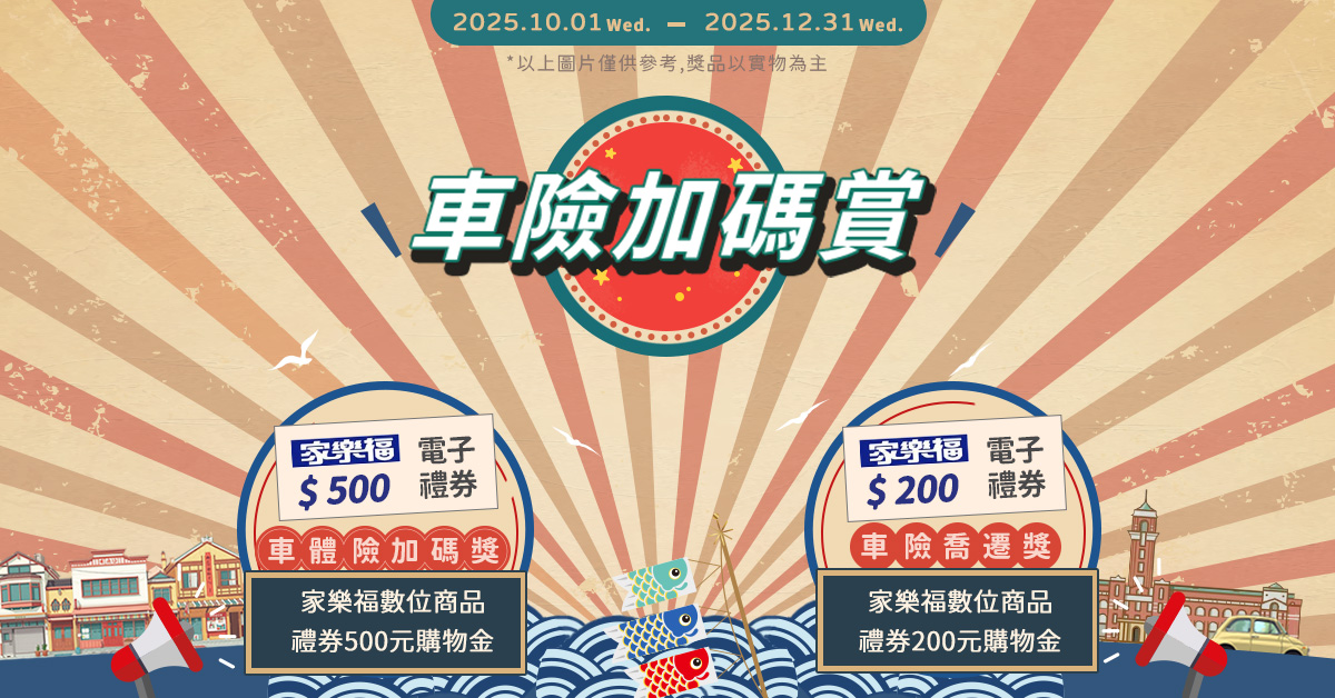 投保「汽車強制險+車體險」並完成付款者,加碼抽「家樂福數位商品禮券500元購物金」。(汽車強制險+車體險需同時投保在同一張保單內)。