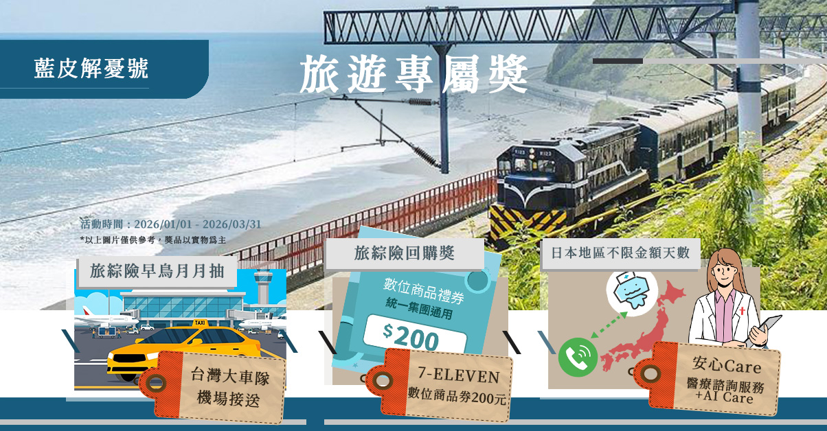 網路投保【強制險+任意險】,即可抽鳴日廚房雙人行、藍皮解憂號雙人行程、台灣大車隊乘車券…等多項大獎。 |