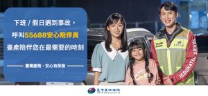 車禍不是任何人願意面對的事情,但在最無助的那一瞬間,如果有人願意給予支持,那份安心,就是我們希望帶給每位保戶的力量。臺灣產物保險和台灣大車隊55688合作的「安心陪伴服務」,是在您徬徨無助的狀況下,有人能站在您身邊、穩定您的情緒、提醒您的安全並與您一起等待警方抵達。我們相信,保險不僅是提供經濟保障,更是在事故發生時,真正能讓您安心的陪伴與支援。